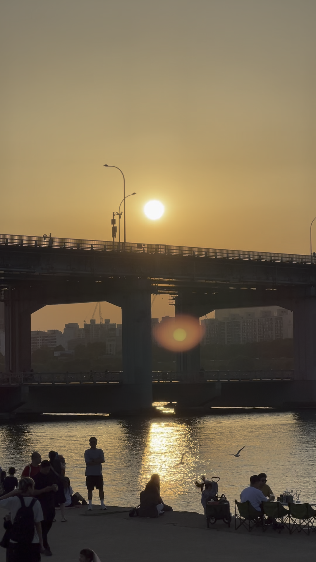 I often spend the day at the Han River, as if I'm traveling. There's no special itinerary. I just walk around excitedly, pleasantly buzzed from some daytime drinking, cross a bridge, and when I get tired, I sit on a bench and rest. I simply enjoy the various faces of the Han River as they change with time, all accompanied by music.