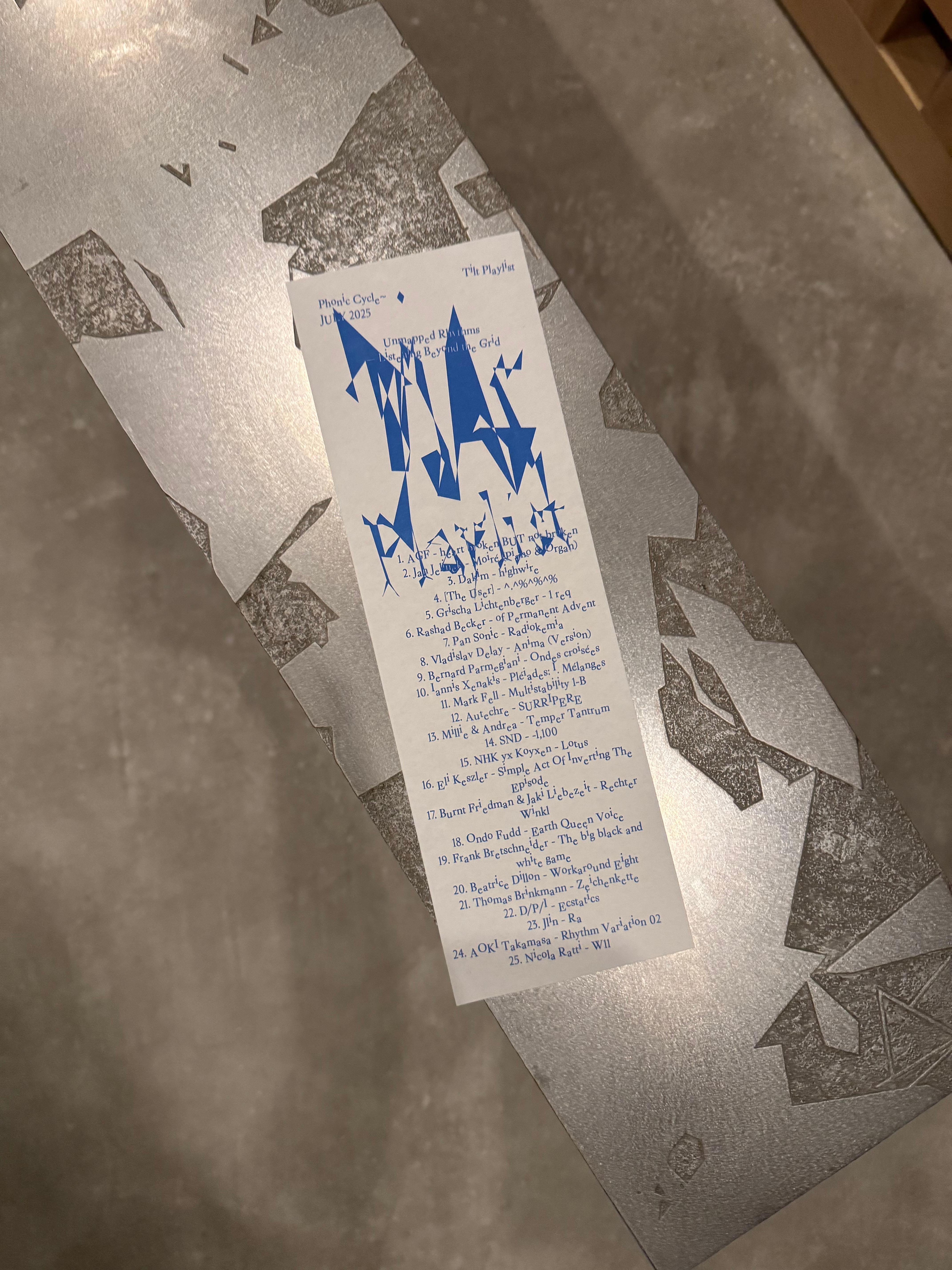 The albums currently being introduced are played sequentially within the Phonic Cycle, a sound curation program in our space, during Tilt's August theme period. The listening experience is arranged differently each day at every hour, leading to a new sensory experience daily.